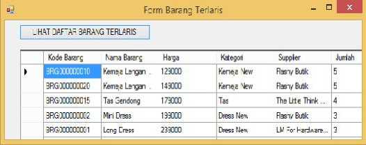 Pada gambar 15 field NmKategori diubah dari ‘Kemeja’ menjadi ‘Kemeja New’. Perubahan pada tabel kategori ini berpengaruh terhadap fungsi GetBarangTerlaris() yang terdapat pada web service Penjualan. Hasil perubahan data pada tabel kategori ini dapat dilihat pada sisi web service client yang telah mengimplementasikan fungsi web service GetBarangTerlaris() seperti gambar 16, 17, 18:
