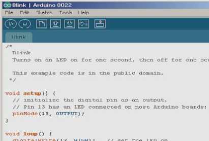 Gambar 3 adalah contoh tampilan IDE Arduino dengan sebuah sketch yang sedang diedit.