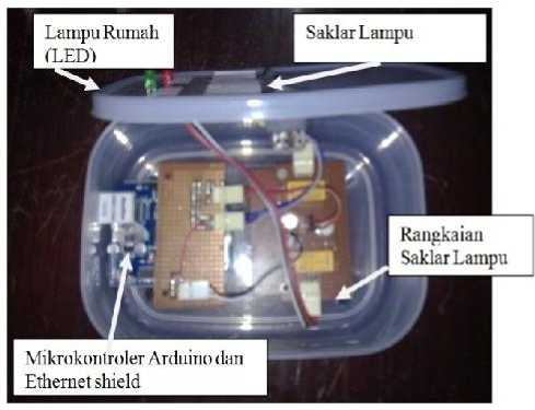 Hasil rancang bangun prototype Rangkaian Pengendali Lampu Rumah ditunjukkan dalam gambar 7. Untuk Lampu rumah dimodelkan dengan menggunakan sebuah LED.