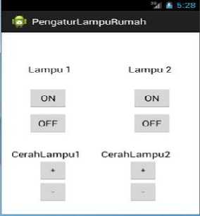 Aplikasi layout dalam perangkat mobile android didesain dengan menggunakan software development tool Eclipse, yang hasilnya dapat ditampilkan dalam emulator android. Aplikasi ini sudah terpasang dalam perangkat mobile android dan diujikan. Gambar 8 menunjukkan hasil rancangan aplikasi pengendali lampu rumah.
