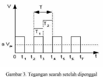 Apabila tegangan searah dipenggal secara teratur seperti tercantum pada Gambar 2 di atas, yaitu pada waktu t1 dimatikan, t2 dihidupkan lagi, t3 dimatikan, dan seterusnya, maka ada tegangan searah yang secara teratur terputus-putus, dimana besarnya tergantung pada T1 dan T2, yaitu :