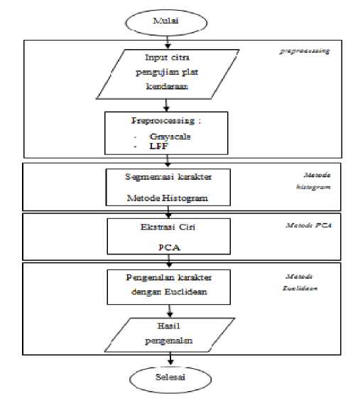 Euclidean distance digunakan untuk menghitung jarak antar karakter. Dimana data hasil dari ekstrasi ciri sudah di masukan kedalam kelompok – kelompok tertentu sehingga sudah di kenali dari karakter plat kendaraan tersebut. Jumlah sampel yang digunakan adalah 20 sample yang berbeda sehingga dimana dari ke 20 sampel yang di pakai kita ketahui presentase berapa jumlah plat kendaraan yang berhasil dikenali karakternya. Untuk alur flowchart-nya dapat dilihat pada gambar 1
