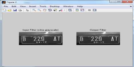 Citra hasil dari proses filtering akan tampak lebih blur (buram) dari citra input sebelum melewati filter. Seperti pada Gambar 4 menunjukkan bahwa jumlah noise direduksi oleh filter pererataan sehingga tepian plat kendaraan tampak lebih halus tanpa noise.