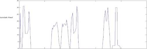 Dapat dilihat pada Gambar 7 dimana setiap karakter memiliki nilainya sendiri, pada saat nilai awal dan akhir setiap karakter tersebut 0 maka itu yang di jadikan patokan pemisah antar karakter tersebut.hasil dari proses histogram selanjutnya akan dijadikan input pada metode selanjutnya.