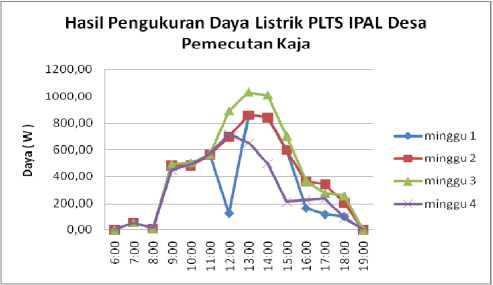 Sistem kelistrikan di IPAL ini yaitu hibrida antara PLTS dengan PLN. Daya dan energi listrik produksi PLTS di IPAL Desa Pemecutan Kaja didapatkan dari hasil perhitungan dan pengukuran. Besarnya daya listrik produksi PLTS merupakan hasil perhitungan antara tegangan (Vdc) dan arus (Idc) keluaran dari modul photovoltaic, sedangkan besar energi listrik produksi PLTS merupakan hasil perhitungan luasan di bawah grafik daya listrik produksi PLTS dan pengukuran besarnya energi listrik dari PLTS untuk memenuhi kebutuhan energi listrik di IPAL. Pada saat pengukuran tegangan (Vdc), arus (Idc) dan energi listrik PLTS ditambahkan keadaan lingkungan pada saat pengukuran. Keadaan lingkungan ini