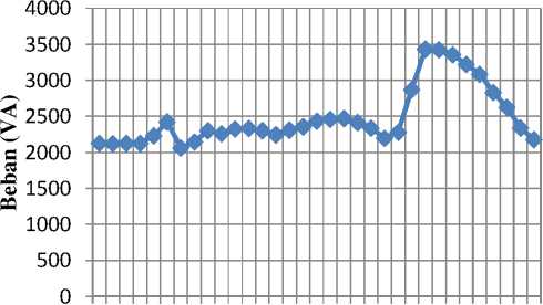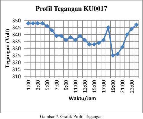 Dari tabel 1 diatas dapat diketahui bahwa salah satu pembebanan trafo KU0017 pada pukul 12:00 sebesar 47,35 kVA dengan profil tegangan 330 Volt dengan persentase drop tegangan 13,23%.