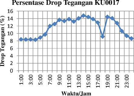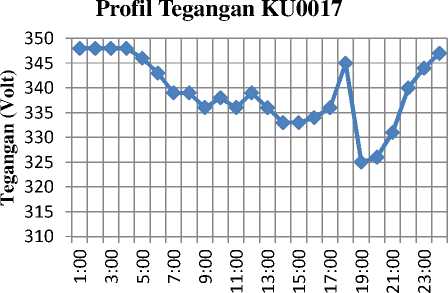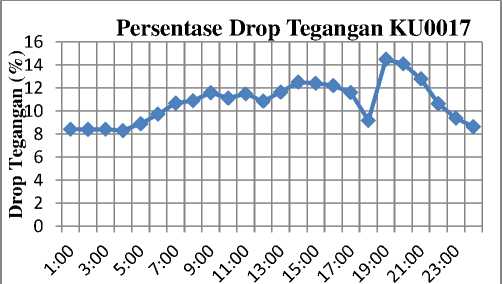 Dapat diketahui besarnya profil tegangan yang terjadi pada Trafo KU0017 pada pukul 12:00 saat tidak beroperasinya PLTS sebesar 330 Volt dengan persentase drop tegangan 13,23%. Profil tegangan saat beban puncak terjadi pada pukul 19:00 sebesar 325 Volt dengan persentase drop tegangan 14,48%. Persentase drop tegangan pada pukul 20:00 – 00:00 mengalami penurunan sesuai dengan grafik diatas. Drop Tegangan pada trafo ini cukup besar dikarenakan letak beban berada cukup jauh dari sumber utama dan tidak beroperasinya DG (PLTS Kubu) .
