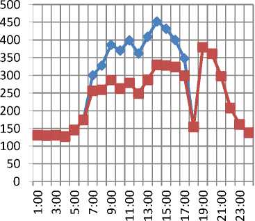 Data daya yang dihasilkan PLTS yang telah dikumpulkan adalah pada bulan September & Oktober 2013, dimana data yang diambil adalah data daya yang dihasilkan tiap jam dari pukul 06:00 – 18:00 untuk setiap harinya dari tanggal 1 – 30 (September) dan tanggal 1 – 31 (Oktober). Dari data-data tersebut kemudian dirata-ratakan. Hasil dari daya PLTS dapat dilihat pada gambar 2 dibawah ini. [6]