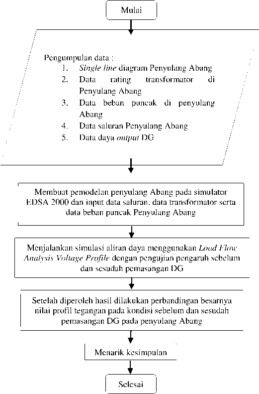Penelitian ini dilakukan di PT. PLN (Persero) Distribusi Bali Area Bali Timur. Tahapan penelitian ini adalah perencanaan diagram alur (flow chart) penelitian pengaruh pemasangan Distributed Generation terhadap profil tegangan pada penyulang Abang. Alur analisis penelitian dapat dilihat pada gambar 3.