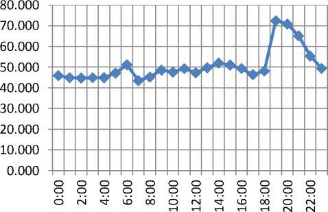 Hasil perhitungan diatas menunjukkan penentuan beban trafo KU0017 pada pukul 01:00 adalah 44,886 kVA untuk jam lainnya pada trafo KU0017 dilakukan dengan cara yang sama menghasilkan pola pembebanan yang dapat dilihat pada gambar 5.