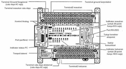 Tiap-tiap PLC pada dasarnya merupakan sebuah mikrokontroller (CPU-nya PLC bisa berupa mikrokontroler maupun mikroprosesor) yang dilengkapi dengan periferal yang berupa masukan digital, keluaran digital atau relay. Perangkat lunak programnya menggunakan apa yang dinamakan sebagai diagram tangga atau ladder diagram. CPM1A memiliki 12 masukan (D0-D11) dan 8 keluaran (O0-O7).