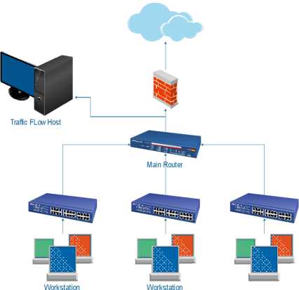 Pada Gambar 1, dapat dilihat PC traffic flow host difungsikan sebagai network capture yang diaktifkan selama 1 bulan penuh untuk menyimpan data trafik. Tools yang digunakan adalah PRTG [11]. Fitur traffic flow pada main router diaktifkan dan dikonfigurasi agar data trafik internet yang berasal dari masing-masing workstation terekam pada PC. Contoh hasil capture trafik seperti diperlihatkan pada Gambar 2.