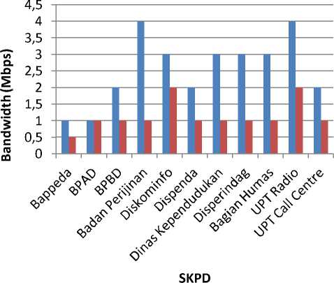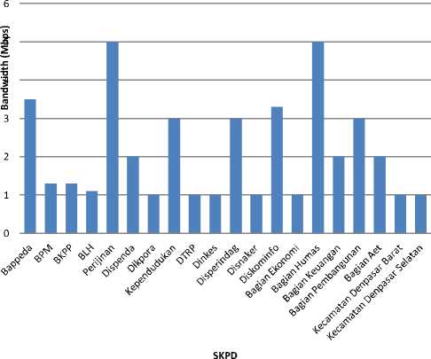 Dari pemantauan bandwidth yang dilakukan pada Dinas Perijinan, didapatkan rata-rata penggunaan bandwidth 5 – 6 Mbps. Media transmisi yang digunakan adalah Fiber Optic dengan througput link 90 Mbps. Jumlah konektivitas sebanyak 50 PC dan 22 Mobile Phone. Namun demikian tidak seluruhnya aktif menggunakan internet secara bersamaan. Jika dibandingkan dengan SKPD lainnya, maka penggunaan bandwidth seperti ditunjukkan pada Gambar 3 berikut