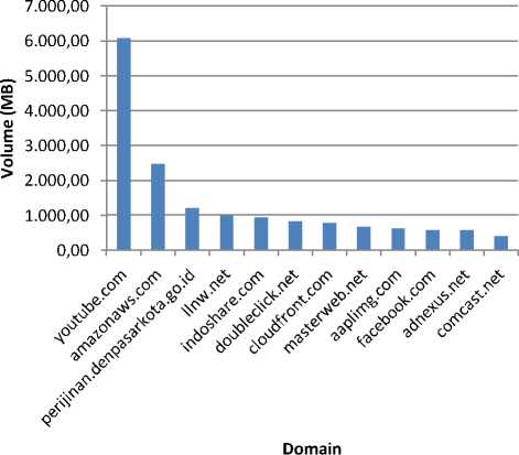 Berdasarkan data Gambar 7 diatas, volume terbesar Dinas Perijinan adalah akses ke youtube.com. Akses berikutnya adalah akses ke domain Content Delivery Network (CDN) seperti amazonaws.com. Domain llnw.net merupakan penyedia content apps, game online dan update windows. Domain applimg.com adalah layanan private CDN yang dimiliki oleh Apple dan mulai dioperasikan sejak tahun 2014.