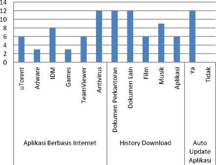 Pada Gambar 2, terlihat data trafik yang meliputi uptime, downtime, total usage, dan trafik berdasarkan application port seperti port http, https, ftp, imap, ssh, dll. Data tersebut dikelompokkan berdasarkan IP Address. PC dengan IP Address tersebut diamati secara langsung untuk mengetahui user behavior. Jumlah PC dan user yang dijadikan sampel sebanyak 12 user yang didasarkan pada volume penggunaan internet terbesar berdasarkan IP address. Pengamatan pada PC dan user dilakukan untuk mengetahui aktivitas user terhadap penggunaan internet di instansi Dinas Perijinan. Aktivitas yang dimaksud seperti pengecekan history download, aplikasi berbasis internet yang digunakan, dan pemahaman user utamanya terhadap malware atau pop up advertising. Malware dengan jenis pop up advertising ini dinamakan adware. Malware dengan jenis ini banyak ditemui menyerang browser di Indonesia [13]. Hal ini disebabkan karena user mengijinkan