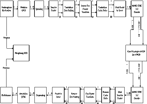 Dengan kelebihan yang dimiliki oleh masing-masing teknik OFDM, spread spectrum dan MIMO, untuk itu dilakukan kombinasi ketiga teknik tersebut menjadi sistem MC-SS MIMO. Kombinasi sistem MC-SS MIMO perlu diuji kehandalan performansinya melalui perbandingan dengan kombinasi sistem yang sudah ada yaitu OFDM MIMO. Penilaian performansi kedua sistem tersebut selanjutnya ditentukan dengan nilai BER (Bit Error Rate) berbanding Eb/No (Energy per Bit to Noise Power Spectral Density Ratio)