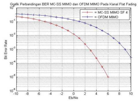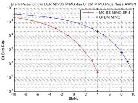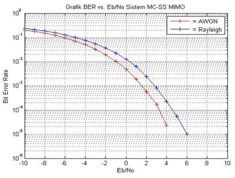 Melalui kedua gambar tersebut dapat dilihat bahwa performansi BER vs. Eb/No sistem MC-SS MIMO dan OFDM MIMO pada kanal AWGN lebih baik dibandingkan dengan Rayleigh. Hal ini dikarenakan pada kanal AWGN hanya terdapat penambahan noise pada bit yang ditransmisikan sedangkan pada kanal Rayleigh bit yang ditransmisikan selain ditambahkan noise juga mengalami efek fading. Selain itu, nilai BER akan semakin berkurang seiring dengan meningkatnya nilai Eb/No pada kondisi noise yang sama baik untuk sistem MC-SS MIMO dan OFDM MIMO.
