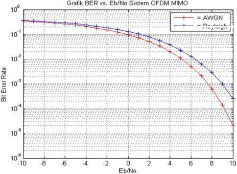 OFDM MIMO untuk semua nilai Eb/No baik pada kanal AWGN maupun Rayleigh Fading.