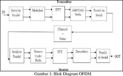 OFDM adalah bentuk khusus dari multicarrier modulation yang membagi aliran data dengan kecepatan tinggi ke dalam sejumlah aliran data kecepatan rendah kemudian dikirimkan melalui beberapa subcarrier. Pada OFDM, data masukan dialirkan ke beberapa subcarrier paralel yang saling orthogonal dengan laju data yang lebih rendah. Subcarrier tidak ditempatkan berdasarkan bandwidth yang ada, tetapi disusun untuk saling overlapping dan diatur jarak antara subcarrier agar memiliki sifat yang orthogonal [4]. Sistem OFDM sederhana ditunjukkan pada blok diagram Gambar 1: