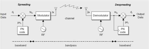 Efek dari perkalian dt dengan PN sequence adalah untuk menyebarkan baseband bandwidth Rb dari dt ke baseband bandwidth Rc [5].