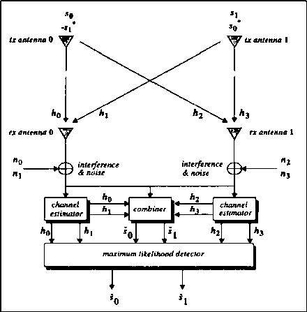 (Tx1) akan mengirimkan sinyal S0 dan antena kedua (Tx2) mengirimkan sinyal S1. Diasumsikan bahwa S0 dan S1 merupakan simbol yang telah dimodulasi. Kemudian pada saat waktu t + T, simbol dari masing-masing antena pemancar dikonjugat sehingga pada antena pertama (Tx0) akan mengirimkan sinyal – dan pada antena (Tx1) mengirimkan sinyal + [4] seperti yang ditunjukkan Gambar 4: