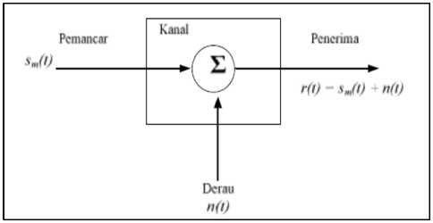 AWGN (Additive White Gaussian Noise) mempunyai karakteristik respon frekuensi yang sama disepanjang frekuensi dan variannya sama dengan satu. Pada kanal transmisi selalu terdapat penambahan noise yang timbul karena akumulasi noise termal dari perangkat pemancar, kanal transmisi, dan perangkat penerima. AWGN merupakan model kanal sederhana dan umum dalam suatu sistem komunikasi [5]. Model kanal ini dapat digambarkan seperti Gambar 6: