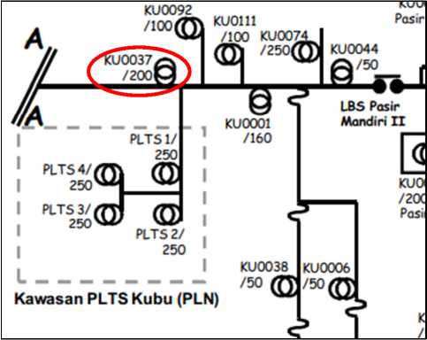 Lingkaran merah pada gambar 3 menunjukkan titik 1 gangguan hubung singkat yang ditentukan oleh penulis, karena pada titik tersebut terdapat beban sebesar 52,9 KVA. Dimana pada saat menyimulasikan pada program ETAP titik tersebut menjadi Bus B217.