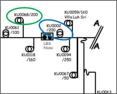 Titik lokasi gangguan hubung singkat dapat dilihat pada gambar 3, 4, dan 5. Dimana gambar tersebut menunjukkan 5 titik lokasi gangguan pada single line diagram penyulang Abang. Lima titik lokasi gangguan digunakan oleh penulis karena pada kelima titik tersebut memiliki beban lebih dari 50 KVA.
