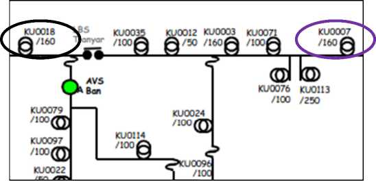 Lingkaran biru pada gambar 4 menunjukkan titik 2 gangguan hubung singkat, dan lingkaran hijau menunjukkan titik 3 gangguan hubung singkat yang ditentukan oleh penulis, karena pada titik 2terdapat beban sebesar 106 KVA dan pada titik 3 terdapat beban sebesar 98 KVA. Dimana pada saat menyimulasikan pada program ETAP titik 2 menjadi Bus B259, dan titik 3 menjadi bus B265.
