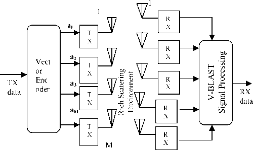 Sistem BLAST merupakan suatu teknik mengirimkan deretan data tunggal yang dimultipleksing dalam M sub deretan dan setiap sub deretan, diubah dalam bentuk simbol yang dilewatkan ke masing-masing pemancar. Pemancar dari 1 sampai M bekerja secara co chanel dengan kecepatan simbol 1/T simbol per detik dengan sinkronisasi waktu simbol. Setiap pemancar itu