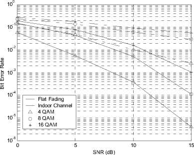 Untuk mengevaluasi unjuk kerja sistem V-BLAST pada kanal pada kanal frequency selective fading (FSF) dengan tingkat modulasi QAM yang berbeda,maka dilakukan simulasi. Simulasi ini menggunakan model-model kanal untuk kondisi didalam ruangan. Disamping itu sistem V-BLAST menggunakan tingkat modulasi J-QAM yang berubah (J=4,8,dan16) dimana jumlah antena pemancar(M) dan penerima(N) dibuat tetap yaitu pada M= 2 dan N=4. Nilai SNR bervariasi dari 0 dB sampai dengan 15 dB dengan perubahan 5 dB, sedangkan nilai rms delay spread yang dinormalisasi juga bervariasi dari 0 (kondisi flat fading) sampai dengan 0,3 dengan perubahan 0,05.