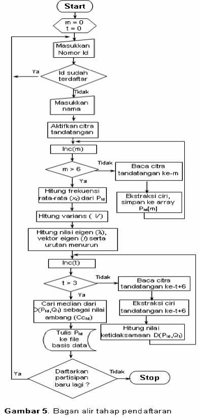 Tahapan pendaftaran dilakukan dengan mengekstraksi ciri dari beberapa tandatangan acuan dan hasil yang diperoleh disimpan pada sebuah file basisdata acuan dengan kata kunci nomor identitas pengguna. Misalkan masing-masing partisipan ke i disebut dengan Pi, menuliskan tandatangannya sebagai acuan sebanyak m, maka dari m buah tandatangan autentik ini diekstraksi ciri menghasilkan m buah vektor kolom x berdimensi p, hasil ini dijadikan satu matriks vektor berukuran p x m.