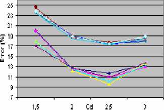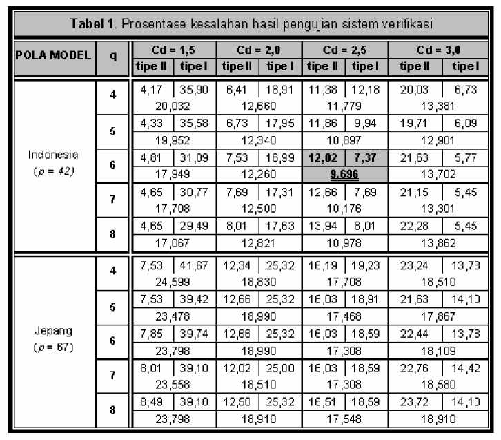 Gambar 8 merupakan grafik prosentase kesalahan rata-rata yang terjadi pada sistem verifikasi ini dan Tabel 1 menunjukkan bahwa ada titik minimum prosentase kesalahan yang didapat dari kombinasi lingkungan sistem, yaitu menggunakan pola model Tandatangan Orang Indonesia dengan konstanta pemotongan nilai eigen q = 6 dan Cd = 2,5. Kombinasi lingkungan sistem ini memberikan prosentase kesalahan terkecil yaitu sebesar 9,696%, dengan rincian kesalahan Tipe I sebesar 7,37% dan kesalahan Tipe II sebesar 12,02%.