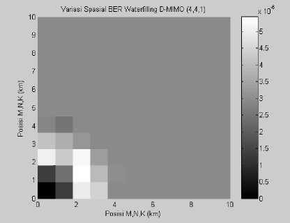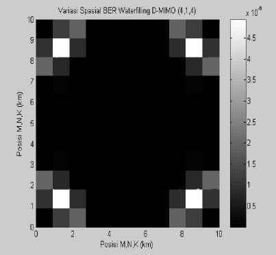 Gambar 12. Variasi Spasial BER Waterfilling D-MIMO (4,4,1)