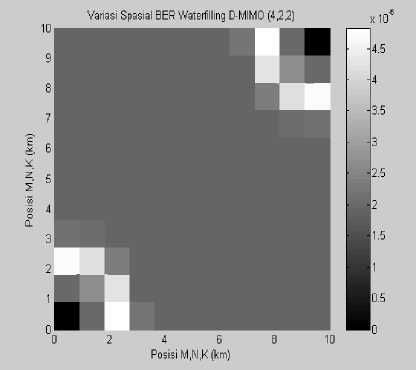 Gambar 11. Variasi Spasial BER Waterfilling D-MIMO (4,2,2)