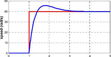 Parameter drive di atas kemudian dimasukkan ke dalam model Simulink yang telah dibuat seperti ditunjukkan dalam Gambar 4. Besaran-besaran yang diminati, seperti arus, tegangan dan kecepatan motor, dapat dimonitor melalui blok osiloskop atau dengan menyimpan hasil simulasi tersebut ke dalam worksheet dan kemudian di-plot dalam bentuk grafik fungsi waktu. Simulasi drive dalam keadaan transien dan mantap dari sistem di atas dapat dilihat dalam gambar-gambar berikut. Gambar 5 menunjukkan respon drive pada saat diberikan step speed demand sebesar 40 rad/s dari keadaan diam yang diberikan pada saat t=1 detik. Pada simulasi ini motor tidak dalam keadaan berbeban.