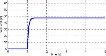 Status dari ggl balik (back emf) selama simulasi tersebut dapat dilihat pada Gambar 8. Terlihat disini bahwa eA sama dengan nol pada saat awal (t<1) dan kemudian secara cepat, seiring dengan kecepatan motor yang meningkat, naik dan akhirnya mendekati