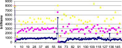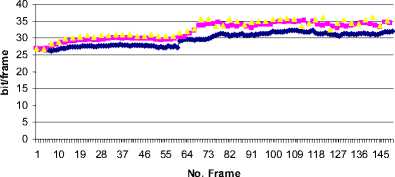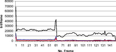 Gambar 2. Jumlah bit/frame video Trevor (149 frame), resolusi 176 x 144 pixel pada Qp tetap