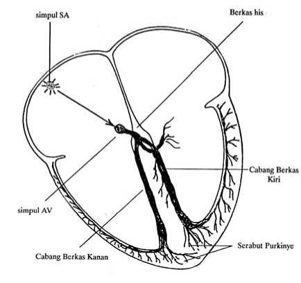 Pada bagian atas serambi kanan terdapat simpul sinoatrial (SA). Simpul SA inilah yang menimbulkan rangsangan yang menyebabkan jantung terkontraksi. Simpul atrioventrikular (AV) terletak pada dinding yang membatasi serambi kanan dan bilik kanan. Simpul ini berfungsi menghantarkan impuls dari serambi ke bilik. Impuls dari simpul AV kemudian diteruskan ke seluruh bilik melalui berkas His. Pada ujung berkas His terdapat banyak cabang. Cabang-cabang ini disebut serat Purkinye. Serat-serat Purkinye bertugas meneruskan impuls dari berkas His ke seluruh otot bilik. Bilik kemudian berkontraksi sehingga darah dipompa keluar dari bilik dan mengalir dalam sistem peredaran darah. Sistem konduksi jantung yang normal dapat dilihat pada Gambar 1.