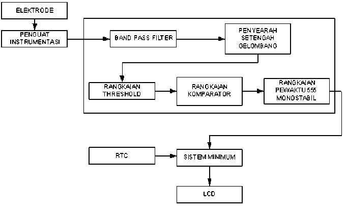 Komponen-komponen yang dibutuhkan untuk merealissikan peralatan ini adalah konduktor penghubung (tranmisi), sumber tegangan, penguat (amplifier), QRS detector yang mencakup QRS filter, half-wave rectifier, threshold circuit, comparator, monostable multivibrator, serta sistem minimum mikrokontroler yang dilengkapi dengan sumber waktu (timer) tetap (RTC) dan display (LCD). Sinyal yang diterima oleh mikrokontroler akan diproses sebagai masukan dalam program untuk menghitung frekuensi detak jantung. Jika mikrokontroler menerima sinyal high yang berasal dari detak jantung maka penghitung akan bertambah satu. Keluaran dari mikrokontroler tersebut merupakan frekuensi detak jantung per menit yang ditampilkan pada layar LCD.