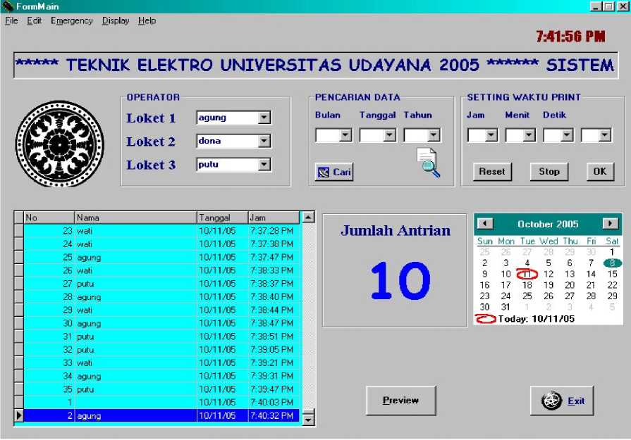 Sedangkan tampilan yang lain merupakan aplikasi tambahan seperti tampilan kalender, tampilan “running teks”, serta searching data nomor yang masuk yang berfungsi untuk memudahkan dalam pencarian suatu nomor yang masuk ke database. Sedangkan tampilan GroupBox setting waktu print adalah untuk mengeset waktu dari pencetakan nomor antrian, merupakan batas waktu dalam melakukan pelayanan. Tombol-tombol “Reset”, “Stop”, “Ok” digunakan untuk mengeset waktu, dalam hal ini waktu untuk mencetak nomor antrian. Sedangkan tombol “Preview” untuk menampilkan tabel database yang akan dicetak/print dan tombol “Exit” untuk menutup/keluar dari program sistem antrian ini.