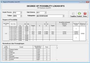 Hasil perhitungan juga sudah dibandingkan dengan hasil wawancara pakar atau expert judgement. Sehingga hasil yang diperoleh sudah sesuai dengan kondisi yang sebenarnya di lapangan. Diperoleh hasil untuk lokasi terbaik penempatan BTS adalah daerah Sanur untuk Kotamadya Denpasar, Seminyak untuk Kabupaten Badung, Tampaksiring untuk Kabupaten Gianyar, dan Delod Peken untuk Kabupaten Tabanan. Perhitungan dengan SPK untuk penentuan lokasi BTS menggunakan metode Fuzzy AHP juga memiliki