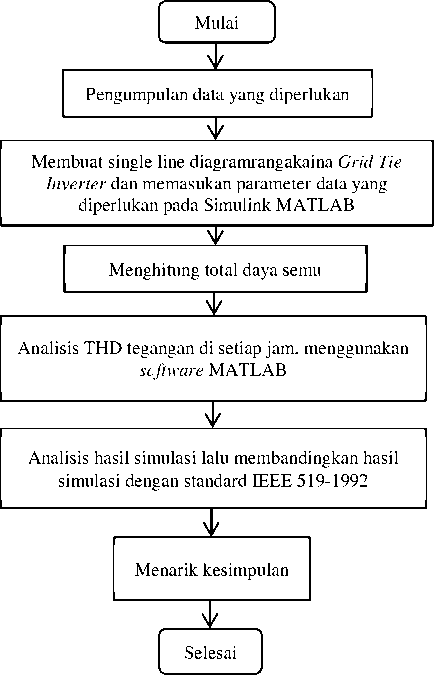 Pada penelitian ini akan dilakukan analisa terhadap inverter, khususnya Grid Tie Inverter saja dan akan dilakukan perhitungan berapa besar harmonisa yang dihasilkan oleh Grid Tie Inverter, dengan menghubungkan pembangkit listrik tenaga surya (PLTS) sebagai sumber energi listrik utama. Dalam hal ini harmonisa terjadi terutama akibat adanya proses switching yang terjadi ketika inverter mengubah arus listrik DC menjadi AC disamping itu inverter juga merupakan beban non linier. Hasil yang didapat dari pengukuran akan dianalisa dan dibandingkan dengan standar IEEE 512 tahun1992 apakah sesuai standar, jika belum akan diberikan solusi seperti pemasangan filter pasif (RLC) untuk mengurangi THD peralatan tersebut. Pada penelitian ini, analisa dilakukan dengan menggunakan software MATLAB.