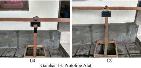 Untuk mencoba alat sensor jarak yang dirancang dalam penelitian ini, penulis membuat sebuah alat bantu yang berperan sebagai prototipe bagian belakang mobil dengan panjang 129cm dan tinggi 59cm sebagai ukuran bamper belakang mobil Suzuki Karimun Wagon R. Prototipe ini terbuat dari batang-batang kayu yang dipasang seperti Gambar 13. Sensor akan dipasang di tengah pada bagian atas protipe dan LCD pada bagian bawah prototipe. Batang kayu panjang pada prototipe tersebut merepresentasikan bamper mobil atau bagian belakang mobil, sedangkan roda yang dipasang dibagian bawah prototipe membantu menggerakan prototipe maju dan mundur, sebagaimana mobil bergerak maju dan mundur. LCD dipasang pada batang kayu agar memudahkan pembacaan jarak yang ditampilkan pada LCD saat menggunakan prototipe. Apabila diaplikasikan pada mobil secara nyata, LCD idealnya akan diletakkan pada dashboard di bagian depan pengemudi bersama speaker dan buzzer. Akan tetapi untuk penelitian ini, peneliti menggunakan prototipe dengan skala kecil agar memudahkan penelitian dan menggunakan waktu dan biaya secara efisien.