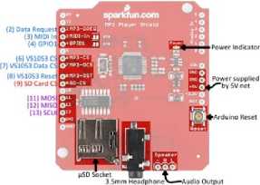 Gambar 2: Bentuk fisik dan konfigurasi pin Mp3 Player Shield