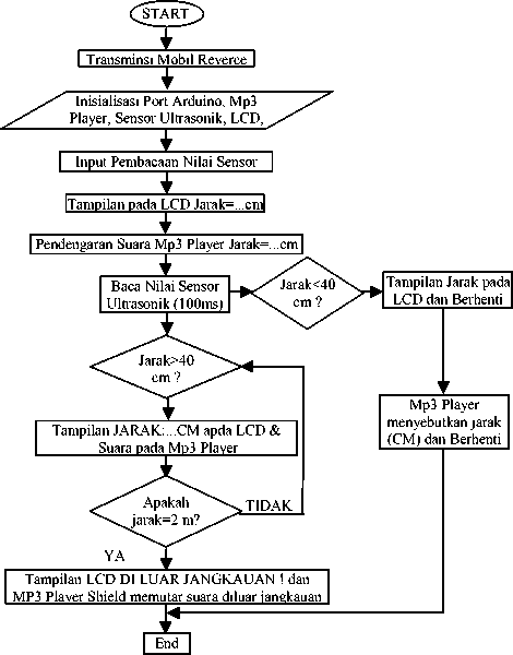 Pada penelitian sebelumnya telah dibuat suatu sistem rekayasa pengamanan parkir kendaraan roda empat transmisi otomatis menggunakan sensor ultrasonik yang dikendalikan oleh mikrontroler Arduino Uno. Alat tersebut mencegah mobil menabrak benda lain dengan cara mematikan keseluruhan kelistrikan kendaraan dan mengunci roda kendaraan sehingga kendaraan berhenti bergerak[1]. Sama halnya dengan penelitian tersebut, penelitian ini juga menggunakan mikrontroler Arduino Uno sebagai pengendali buzzer dan LCD untuk output. Akan tetapi, penelitian tersebut tidak menggunakan MP3 Shield Player dan speaker. Alat yang dibuat dalam penelitian ini dapat memberikan informasi jarak yang terdeteksi tidak hanya melalui tulisan di LCD saja atau melalui dengingan buzzer, akan tetapi melalui audio yang disuarakan oleh speaker sehingga pengemudi tidak diharuskan menatap LCD untuk mengetahui jarak.
