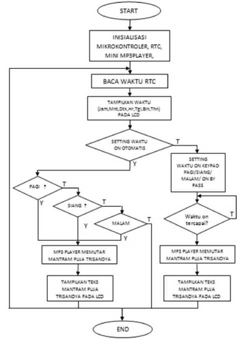 Diagram alir (flowchart) program dari Alat Otomatisasi Mantram Puja Trisandya, ditunjukkan pada Gambar 9. Pertama adalah inisialisasi mikrokontroler Atmega328/Arduino Nano, RTC, LCD, mini MP3 Player, dan siap untuk beroperasi. Proses looping dimulai dari pembacaan waktu pada RTC. Dilanjutkan dengan menampilkan waktu tersebut pada LCD. Apabila state logic tidak pada penyetingan waktu pemutaran file Mantram Puja Trisandya, maka state dilanjutkan dengan mecocokkan hasil pembacaan waktu RTC dengan salah satu waktu pemutaran Puja Trisandya yang telah ditentukan, jika sesuai maka alat akan memutarkan file Mantram Puja Trisandya. Setelah pemutaran file Mantram Puja Trisandya selesai, maka alur akan kembali ke proses awal looping yaitu pembacaan waktu RTC. Selanjutnya apabila state logic saat ini berada pada penyetingan waktu pemutaran file Mantram Puja Trisandya maka logic akan menerima masukan untuk mengubah waktu pemutaran file Mantram Puja Trisandya, setelah perubahan tersimpan maka alur akan kembali ke proses awal looping. Looping ini akan berjalan terus sampai alat dimatika.
