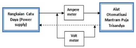 Pengujian konsumsi daya listrik pada rangkaian utama dilakukan dengan mengukur nilai tegangan dan arus setelah rangkaian catu daya/voltage regulator. Diagram blok dari pengujian konsumsi daya listrik pada rangkaian utama ditunjukkan pada Gambar 14.