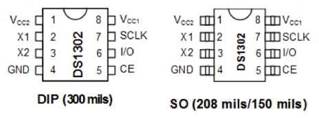 Komunikasi dari mikrokontroler ke IC DS1302 ini dilakukan melalui antarmuka serial tersinkronisasi yang sederhana melalui 3 jalur I/O: RST (reset), Data, dan SCLK (serial clock). RTC DS1302 memiliki 8 buah pin dan tersedia dalam bentuk 8-pin DIP serta 8-pin SOIC. Konfigurasi dari DS1302 ditunjukkan pada Gambar 2 [5].