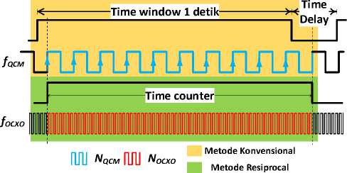 Pencacah frekuensi yang dikembangkan pada penelitian ini merupakan pengembangan dari pencacah frekuensi metode hybrid. Metode ini menggabungkan antara metode konvensional yang berbasis frekuensi dan reciprocal yang berbasis periode untuk mencacah sinyal input dan sinyal referensi selama rentang waktu tertentu yang dikendalikan oleh sinyal time-gate satu detik [9], [16]. Skema sinyal yang menunjukkan bagaimana metode ini bekerja ditunjukkan pada Gambar 2. Pada gambar tersebut ditunjukkan bagaimana sinyal dari sensor QCM (fQCM) dicacah selama rentang time window satu detik berdasarkan metode konvensional.